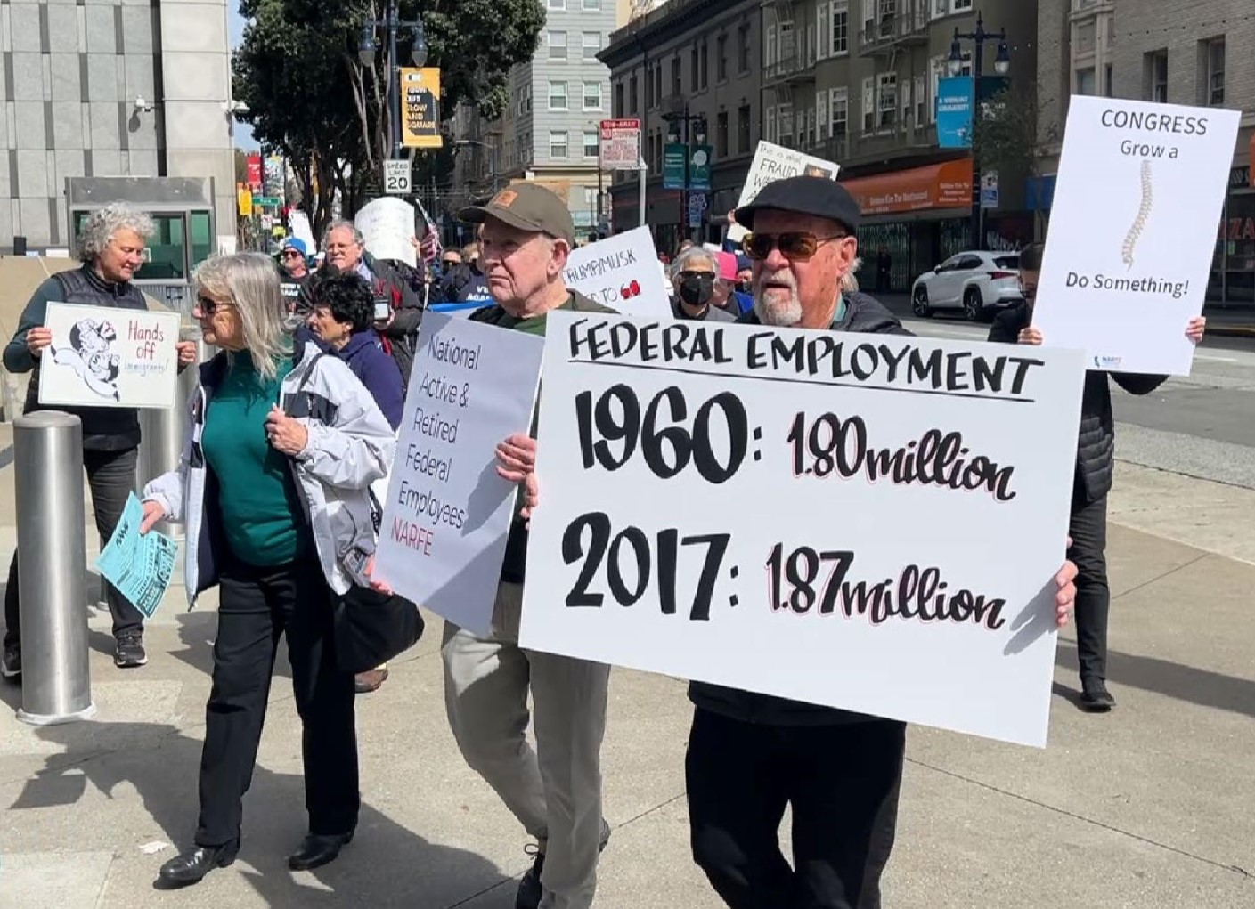 Saturday, March 15, 2025 Bay Area NARFE chapters came together with three federal employee unions (APWU, NTEU and AFGE) to field 200 – 250 Feds to march around the San Francisco Federal building.  The Federal Building is where, two days before, Judge William Alsup ruled that OPM had acted illegally in terminating tens of thousands of federal employees.  Protesting those terminations, and calling on Congress to do something to stop the shredding of the federal government as we’ve known it most of the past 150 years, NARFE members show we are united. The Rally and March was covered by at least three local television stations and featured on their Saturday evening news programs and again during their Sunday morning programming. Here’s ABC 7’s “News at 11” clip featuring an interview with NARFE CA Legislative Chair Steve Walter.