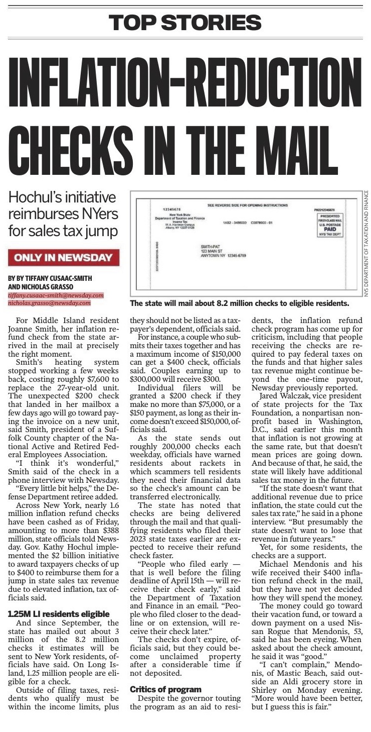 Recently NARFE Region 01 Configuration Advisory Board (CAB) Representative Joanne Smith was featured in the Long Island and New York Newsday News. The attached image cites an interview with Joanne about receiving the inflation-reduction check from the state of New York. Congratulations, Joanne!