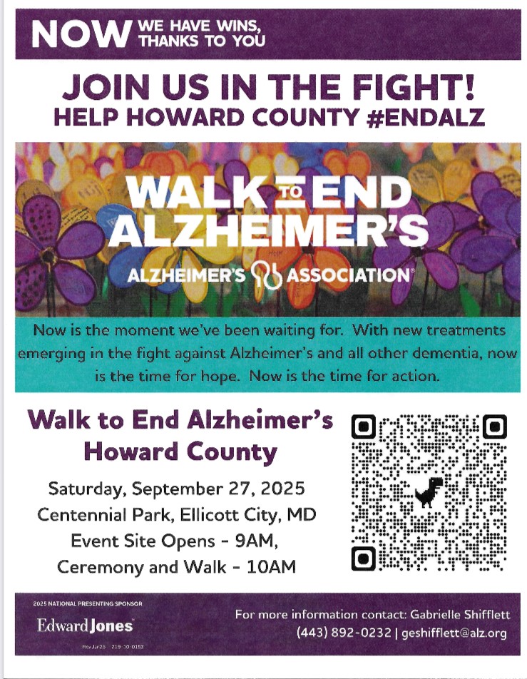 colorful flyer promoting Howard County Walk to End Alzheimer'sJoin the Howard County Walk to End Alzheimer’s on Saturday, September 27 at Centennial Park.