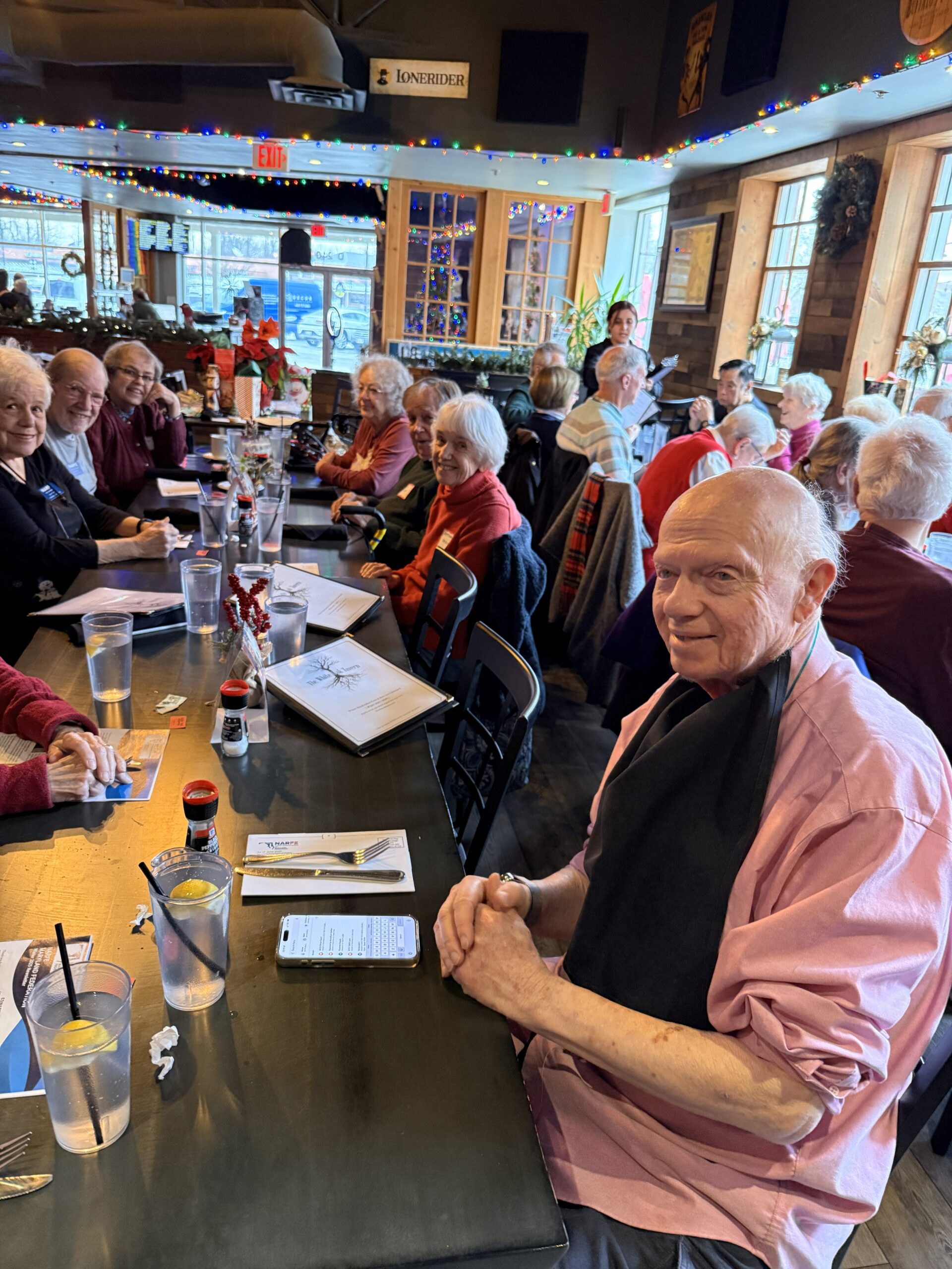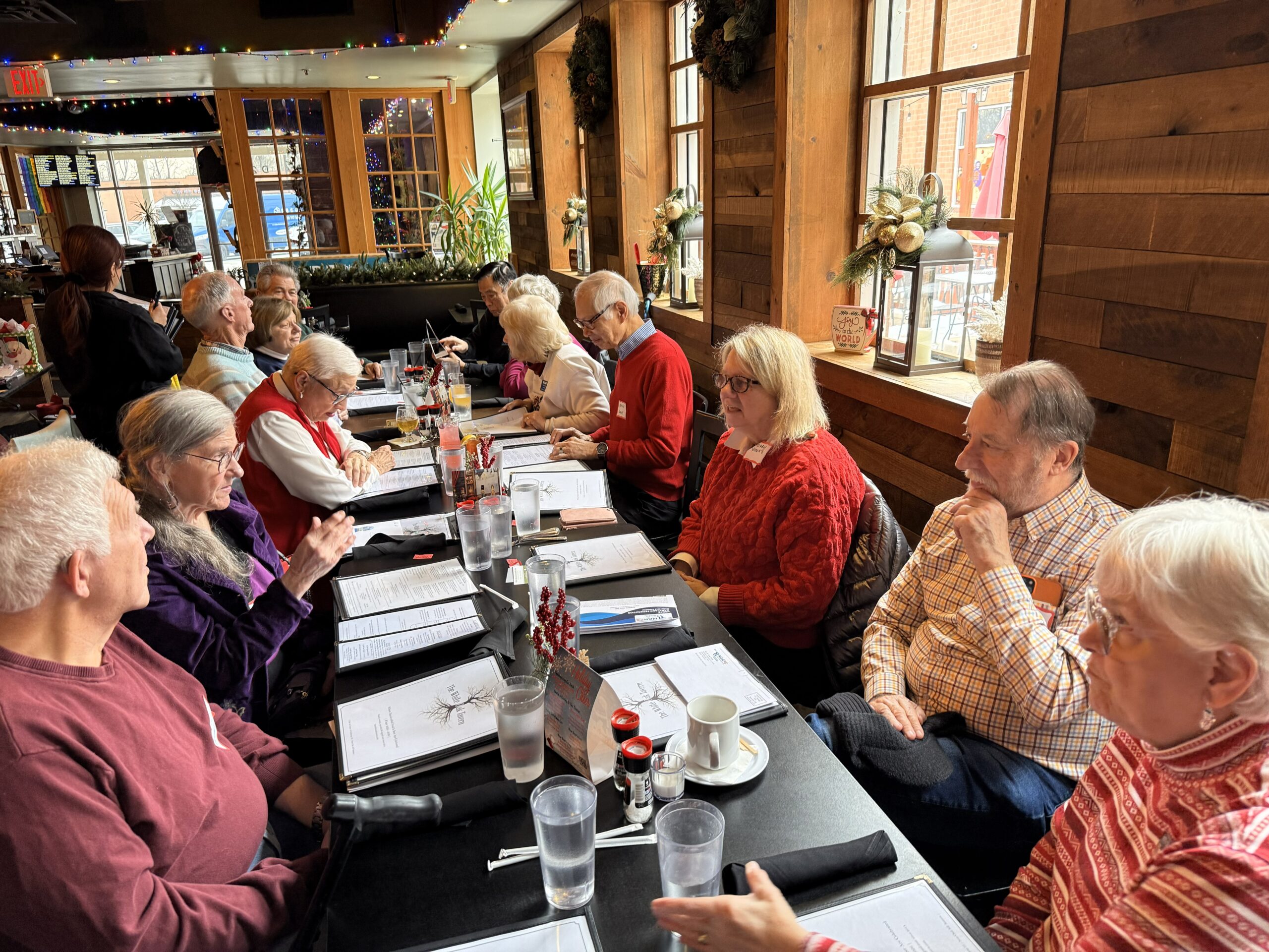 NARFE members gathering for holiday lunch at White Oak Tavern decorated for Christmas.