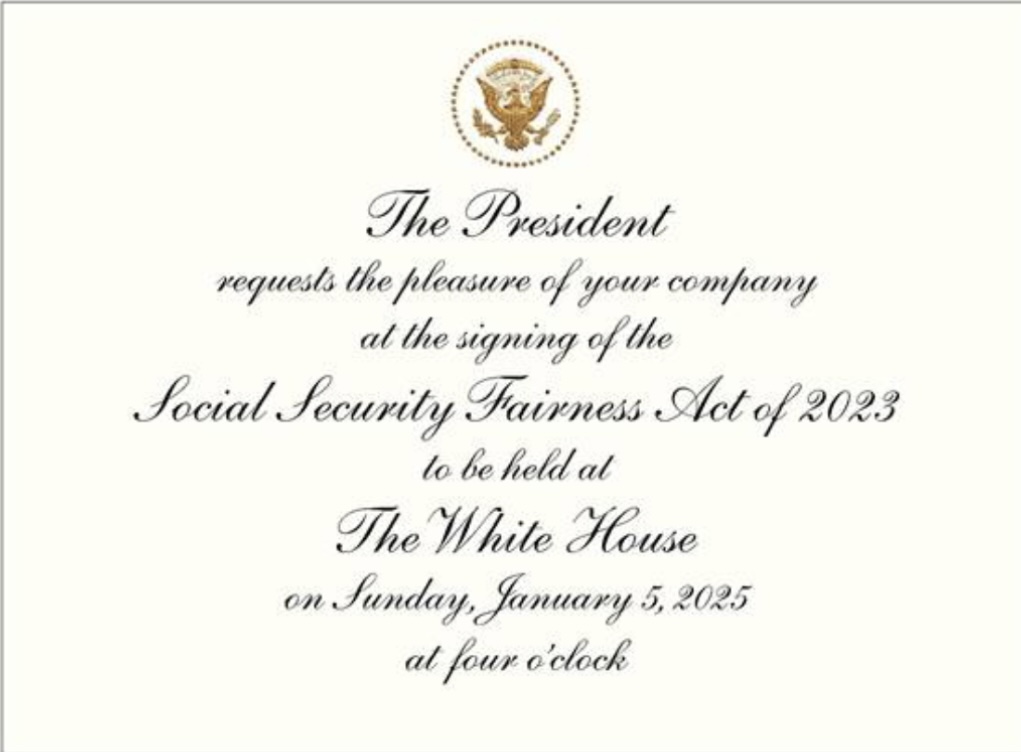 White House invitation to attend the signing of the Social Security Fairness Act of 2023 on Sunday, January 5, 2025 at 4:00 pm