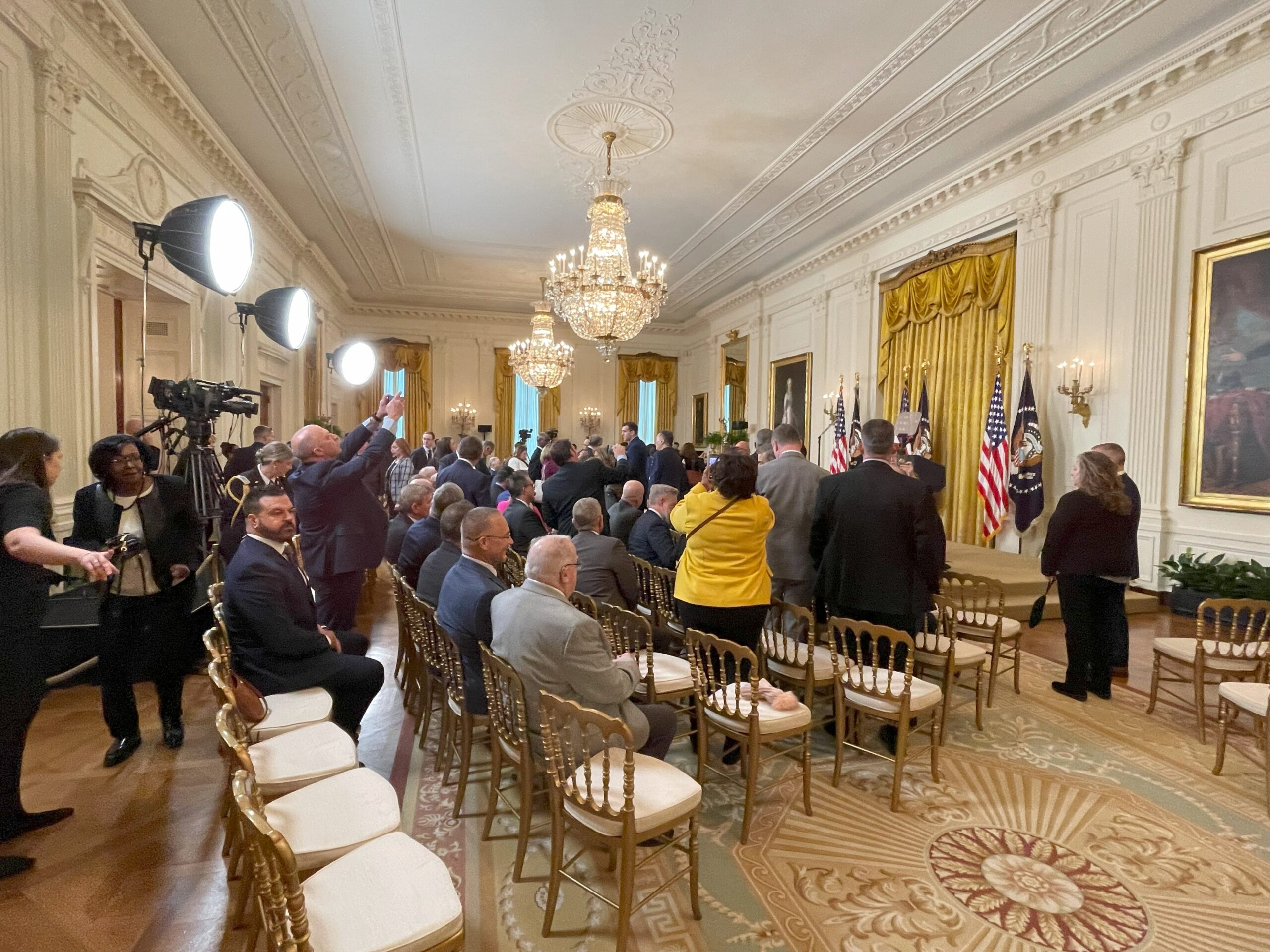 White House East Room with chandeliers, TV cameras, people sitting in rows of chairs and taking cell phone photos, with the U.S. and Presidential Seal flags lining the stage.