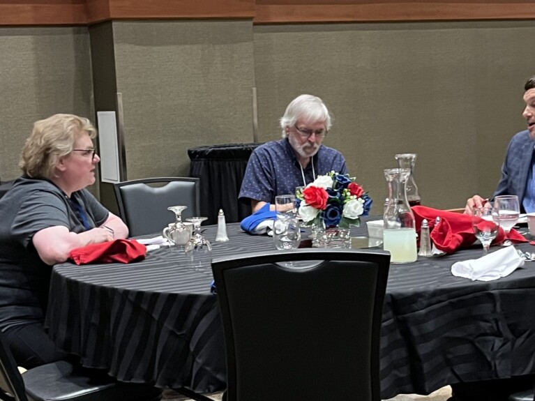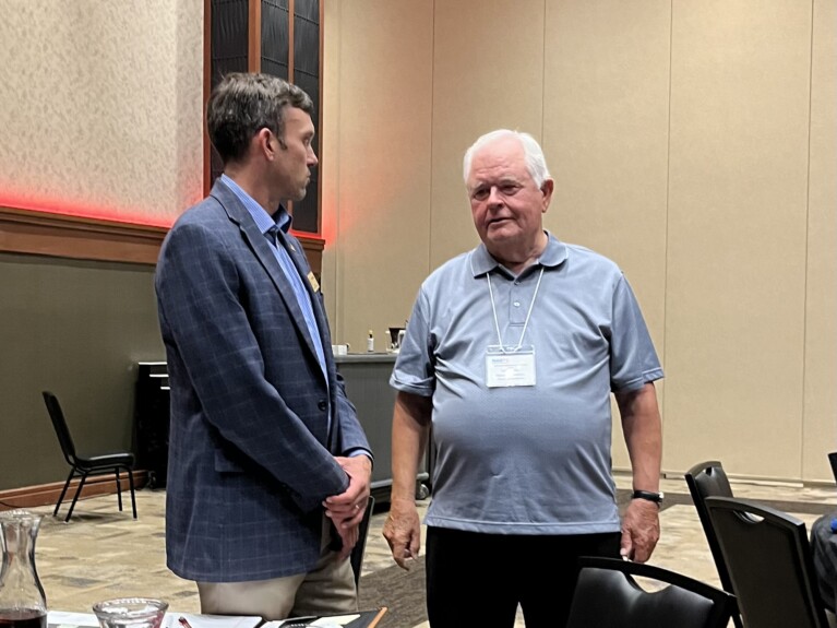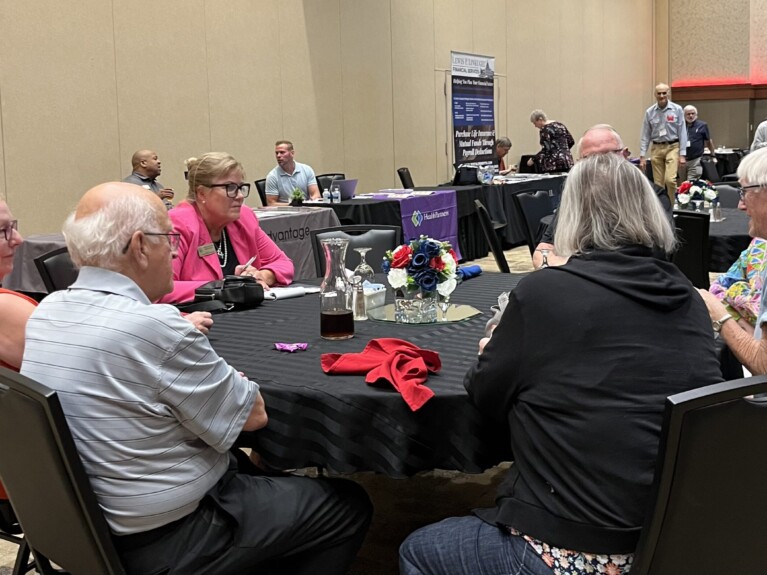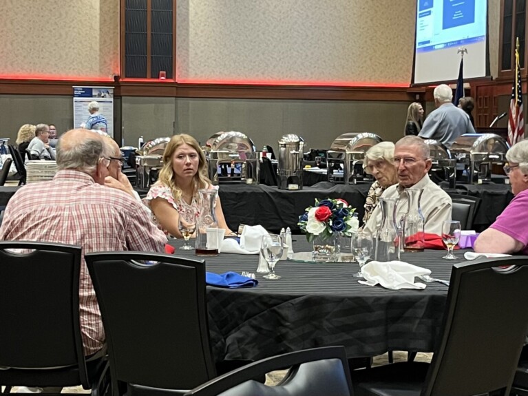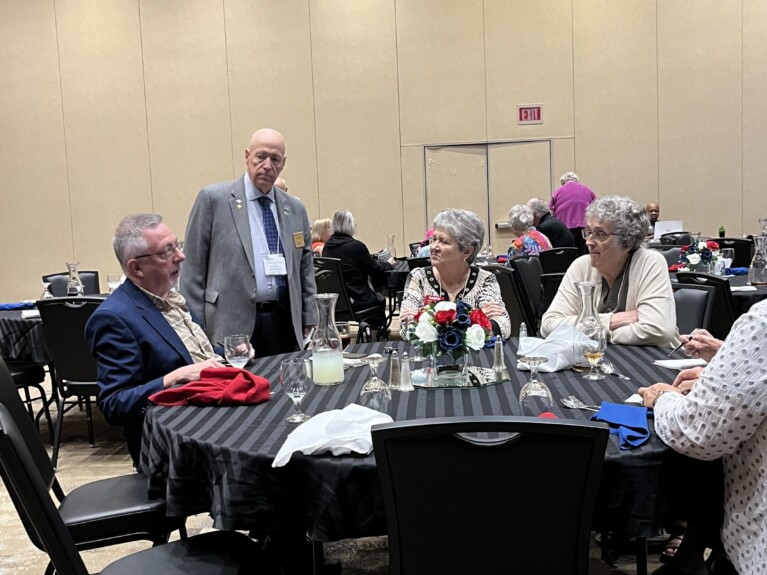 Doug Stout District Representative for Mariannette Miller-Meeks talking with constituents and NARFE National President Bill Shackelford