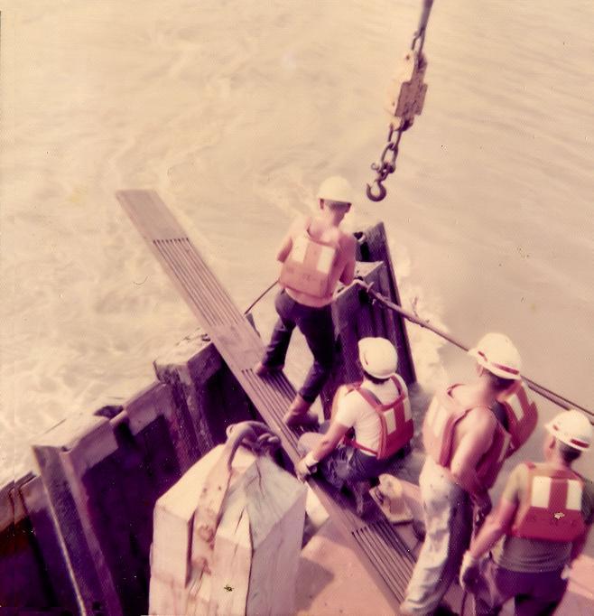 ( left to right) Tom Diaz (kneeling), Eddie Nunn, Ron Hall behind Eddie and Lawson Hammond (far right).The only thing holding that diving board in place is the weight of the people standing on the board. To hook the prop James Hopper had to go out on the end of the board.