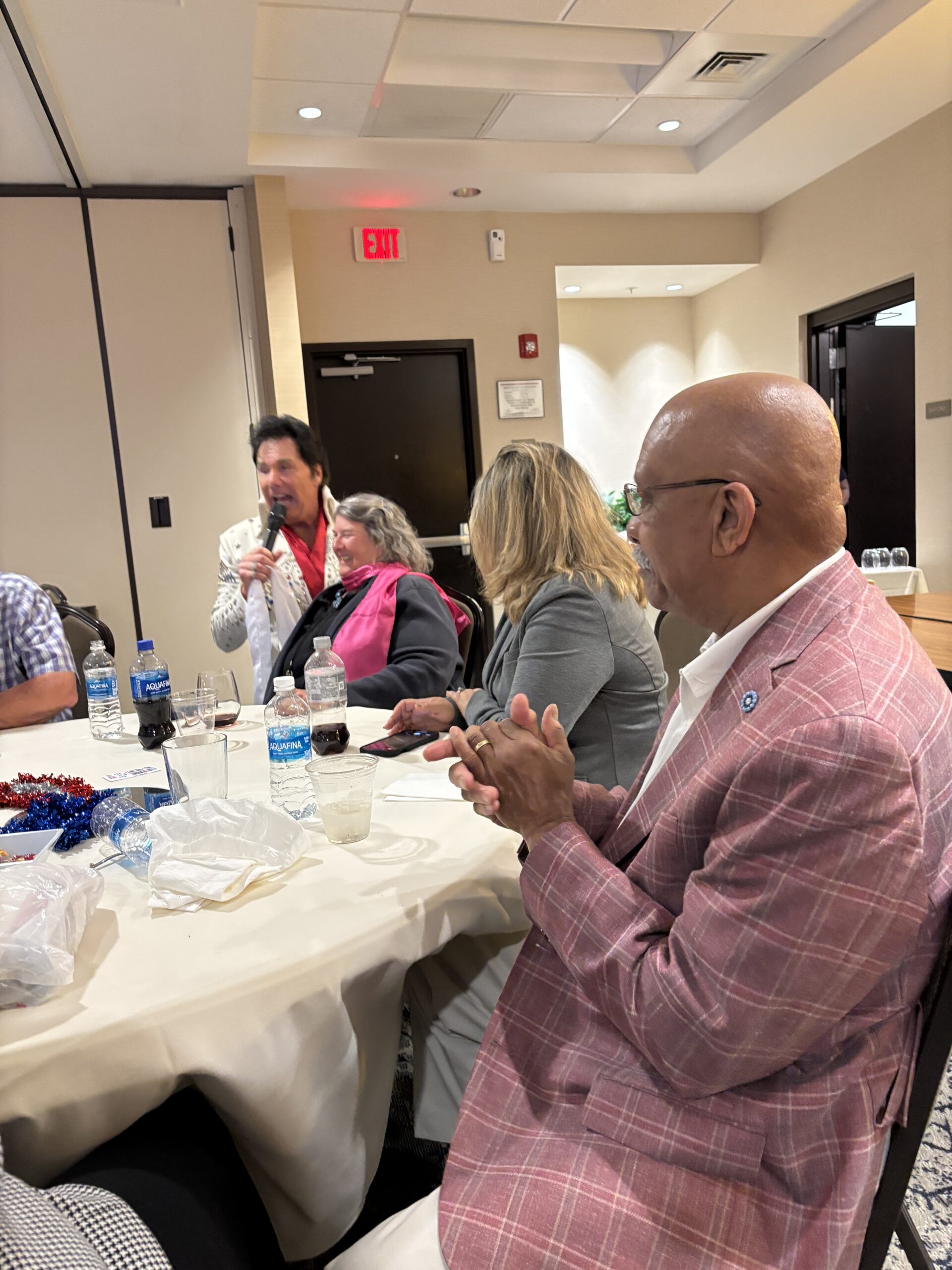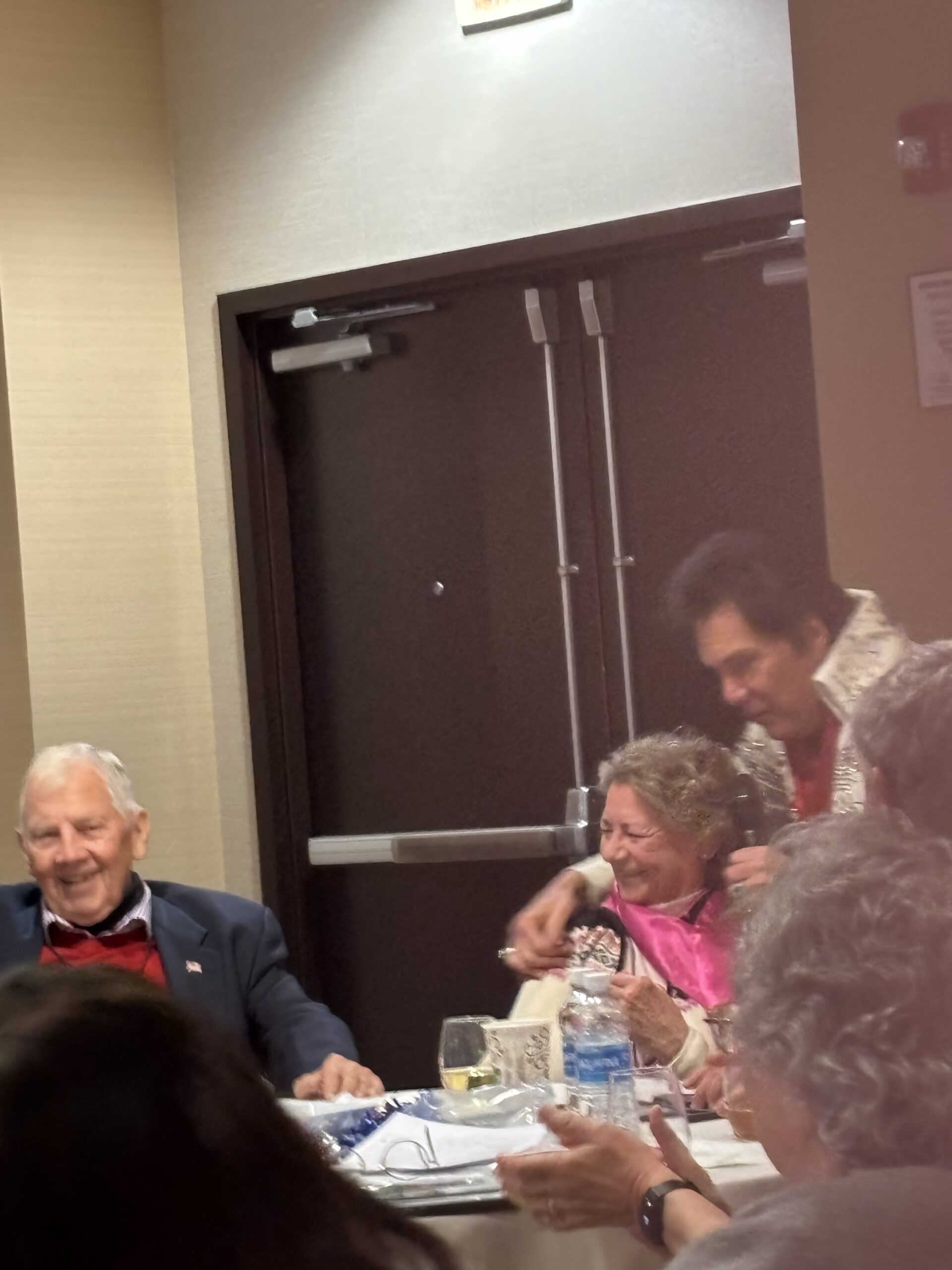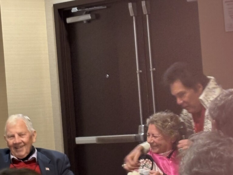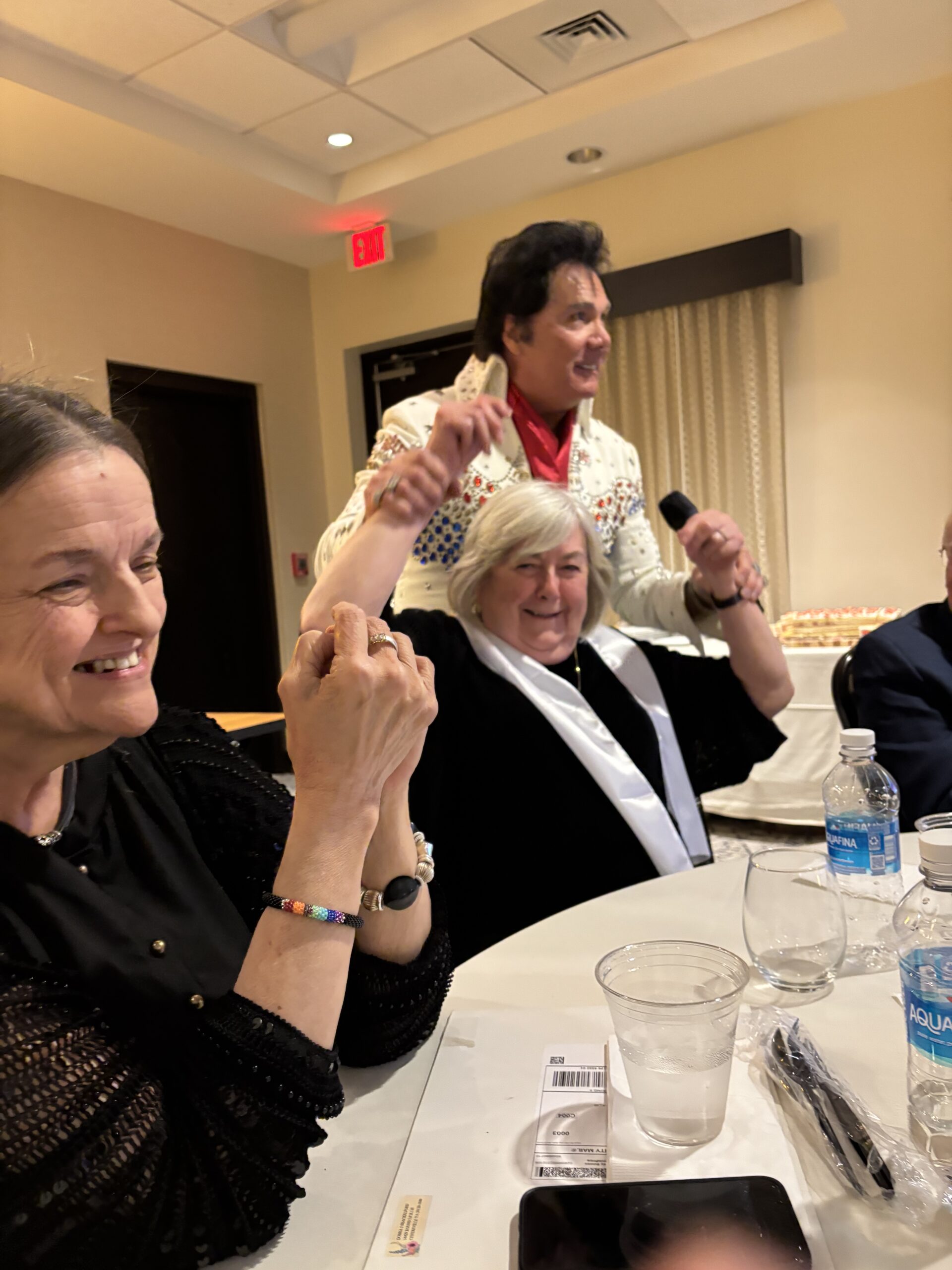 Elvis is singing and entertaining one of our members. We are having a good time!