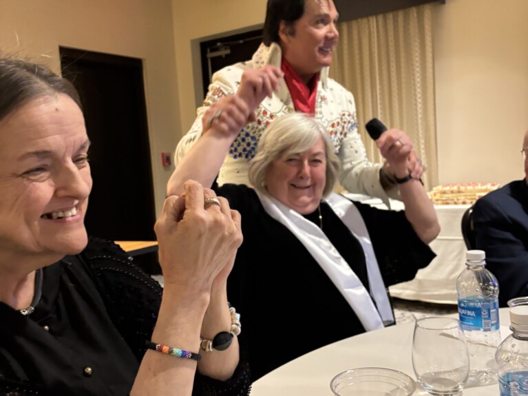 Vivian looks on while Elvis is bringing a smile to Mary.